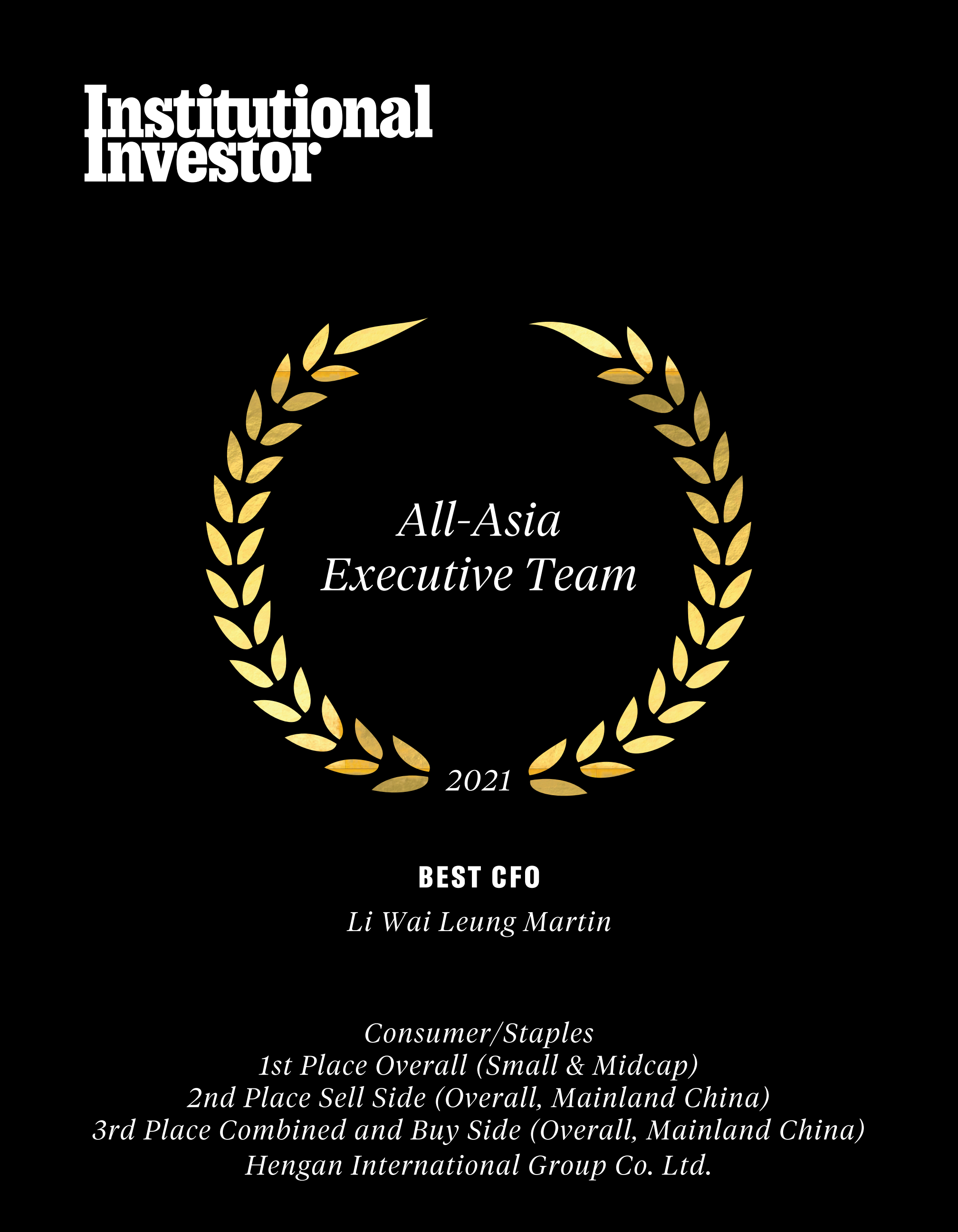 近日,国际权威财经杂志《机构投资者》(Institutional Investor)公布了“2021年度亚洲区公司最佳管理团队”(2021All-AsiaExecutiveTeam)评选结果,贝斯特国际集团蝉联“受尊崇企业”名衔及必需性消费品类别组别中的多项殊荣,包括“最佳投资者关系活动”、“最佳环境、社会及企业管治(ESG)”、“最佳行政总裁”许连捷先生、“最佳财务总监”李伟樑先生。